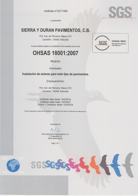 SIERRA Y DURAN PAVIMENTOS tiene implantado un Sistema de Gestión de Seguridad y Salud según los requisitos de la Norma OHSAS 18001:2007, certificado por la entidad SGS.